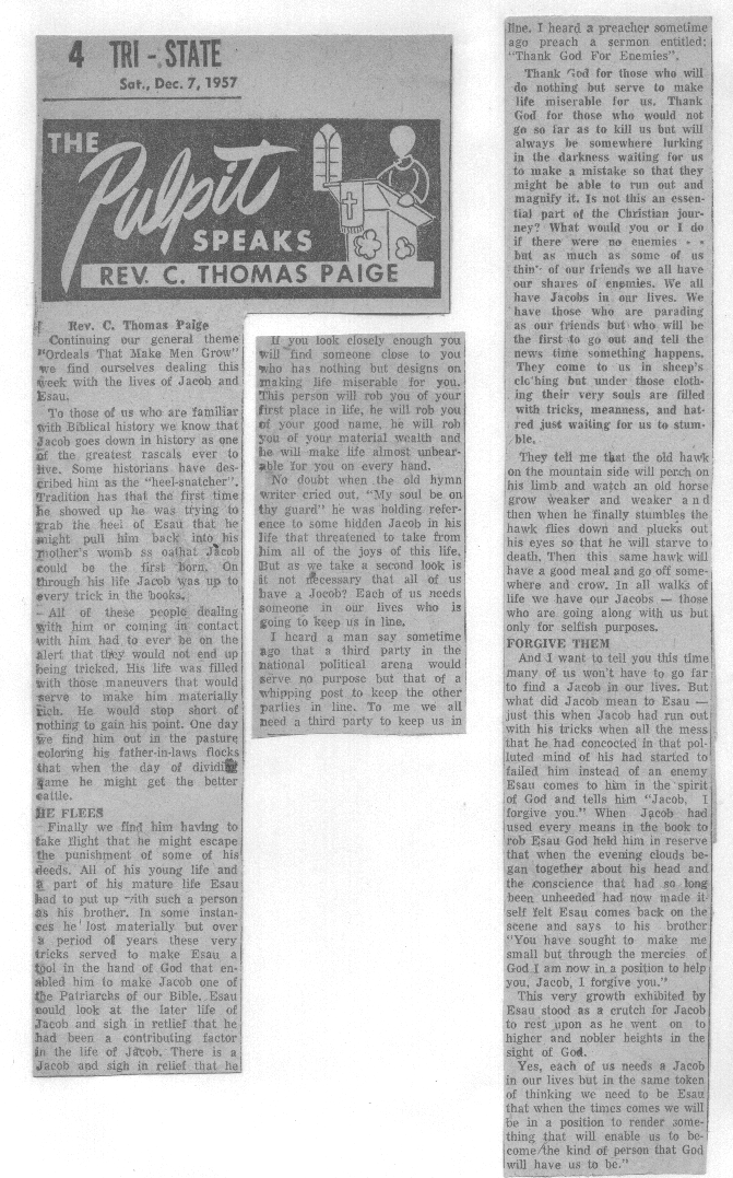 It is these last ten years of his life that I remember. Anything before that is just the product of my being the family historian. I was three years old when we came to Phoebus and 13 when my father died. In between, the Reverend Charles Thomas Paige was just Daddy to me. I recall waving to him as he left on Monday morning to drive to the Eastern Shore where he taught biology at Mary N. Smith High School. I recall waiting anxiously for him to return on Friday evenings, vaguely aware that he was teaching during the day and working at the Campbell Soup factory at night. I remember taking him fried egg sandwiches and iced coffee to the cleaners on the corner where he worked on Saturdays. I remember the car trips to churches outside of Phoebus where he was invited to preach, especially one in Kilmarnock, which became a favorite of mine. I recall the letter that he sent me when I was at 4-H camp the summer after 4th grade. “Pumpkin, here’s two dollars” the letter said. I recall standing in the doorway of the family room, afraid to enter, because my mother had caught me smoking and Daddy, the family disciplinarian, was about to mete out my punishment. I recall him coming to a band concert of mine when I was in the 7th grade, him standing with his cane in the rear of the auditorium, his body weakened by the diabetes that had taken hold, half of his foot having been amputated. And I recall my little brother, coming to my cheerleading practice and telling me that I had to come home – immediately – and him blurting out that “Daddy is dead.”