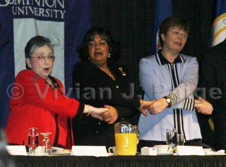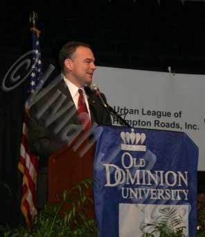 Seated at the head table were (L-R) Edith White, President of the Urban League of Hampton Roads, Thomas Hasty, a member of the Board of Directors, Governor Tim Kaine, ODU President Dr. Roseann Runte, Norfolk Mayor Paul Fraim, Virginia Beach Mayor Meyera Oberndorf, NSU President Dr. Carolyn Meyers, and TCC President Dr. Deborah DiCroce. (Not shown far right Rev. Berkley Ford and far left Rev. Reginald Woodhouse.)