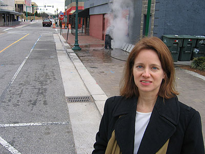 The woman in the photo (credit to John Warren of the VP) was one of those whose car was towed. As the article reports, she would like to see some changes made to make it clear that no parking is allowed: eradication of the parking spaces, “Towing” signs and orange barrels on the curb.