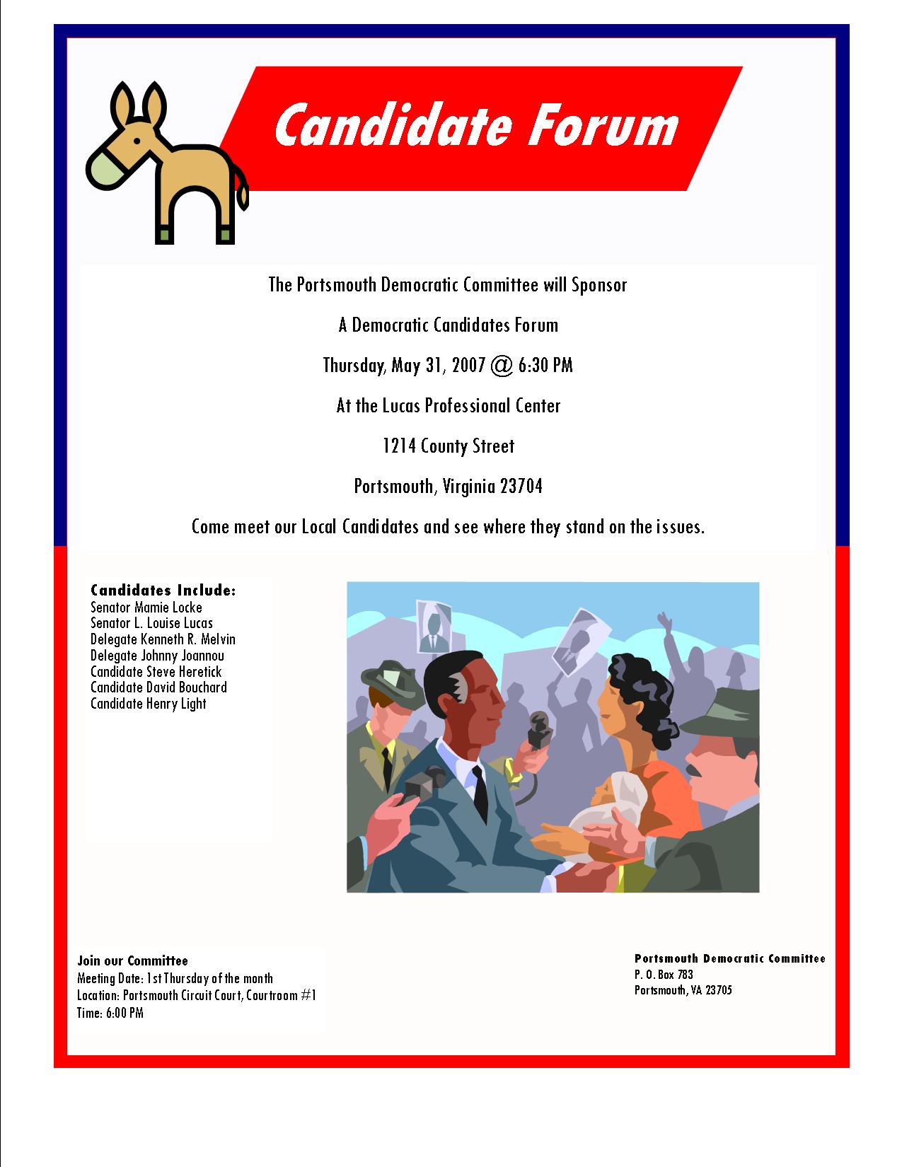 The PDC is sponsoring a Candidate Forum on Thursday, May 31, 2007 (see attached flyer). Open to all, the forum includes the Democratic candidates in the Portsmouth/Chesapeake area, including those candidates who will be in the primary on June 12.