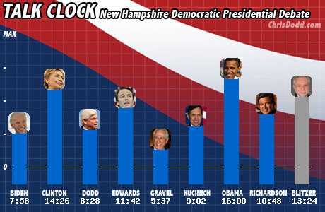 Contender Chris Dodd put together this chart which shows the amount of time that each candidate got in last night’s debate. The fact that “moderator” Wolf Blitzer got the third highest total should tell you something.
