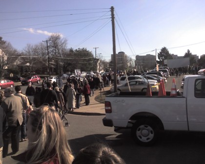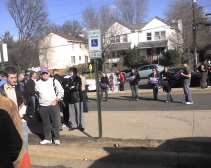 update 3:32pm – “The Hillary campaign clearly didn’t realize the extent of her support in NoVA (and people traveled from *all over* to be here), as the venue couldn’t accommodate the thousand plus turnout (everyone is awful at estimating, but I bet we’ll hear it was at least that). Even after the doors were closed and the fact that no overflow would be available was announced, people decided to stick around, hoping for a glimpse of her when she moved from the motorcade to in the inside of the building. Your humble correspondent admired their dedication, but his previous experience with motorcades and Secret Service made him realize it would be a pointless endeavor, and packed it in. As I was leaving, the doors opened briefly to let a further 50 people into a room where the audio would be piped in.”