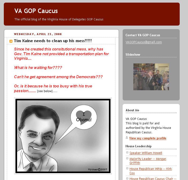 Of course, the sub-title for the blog still reads, “The official blog of the Virginia House of Delegates GOP Caucus.” What a bunch of winners. Too bad you can clearly see the paid for by disclaimer in the screen cap Vivian took of the stolen artwork….