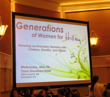 I drove from Norfolk to Richmond and met up with three other women who were going to the event. The trip to DC was uneventful (except for getting lost once we got into the city, a situation remedied fairly quickly thanks to Google Maps that I have on my Blackberry). We chatted about Tuesday’s primaries and what that means for the Clinton campaign. I was, of course, disappointed with the results. Upon arriving at the hotel and seeing women streaming in, it was quite easy to forget about Tuesday π