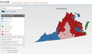 The Cook Political Report updated the race in the 2nd Congressional District Tuesday from Lean Republican to Toss Up. The race in VA-05 has been upgraded from Likely Republican to Lean Republican. The photo to the left reflects these changes (click to enlarge).