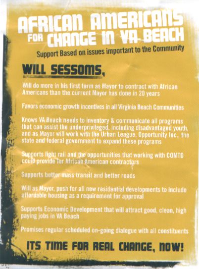 Except for this story, which I wrote about here, little has been said about the effect of the fliers distributed on Election Day on behalf of now mayor-elect Will Sessoms. As you can see, the fliers showed Sessoms, a Republican, with an image of Obama. And, in violation of the law, the fliers did not contain any paid for/authorized by disclosures. Of course, who’s going to complain about this? If Meyera Oberndorf did, folks would say it was sour grapes. And who expects Sessoms, the beneficiary, to complain? On top of it all, even if someone complained, guess what the penalty is? $100. We put so little value on campaign shenanigans that this kind of thing goes on every election. So I decided to take a look.