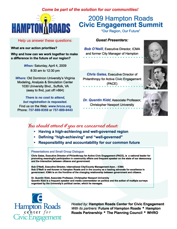 The Hampton Roads Center for Civic Engagement (HRCCE), along with its partners, Future of Hampton Roads, Hampton Roads Partnership, The Planning Council, and WHRO, will be hosting a civic engagement summit on Saturday, April 4 at the ODU Modeling, Analysis & Simulation Center from 8:30am to 12:30pm (details on the flyer – click to enlarge).