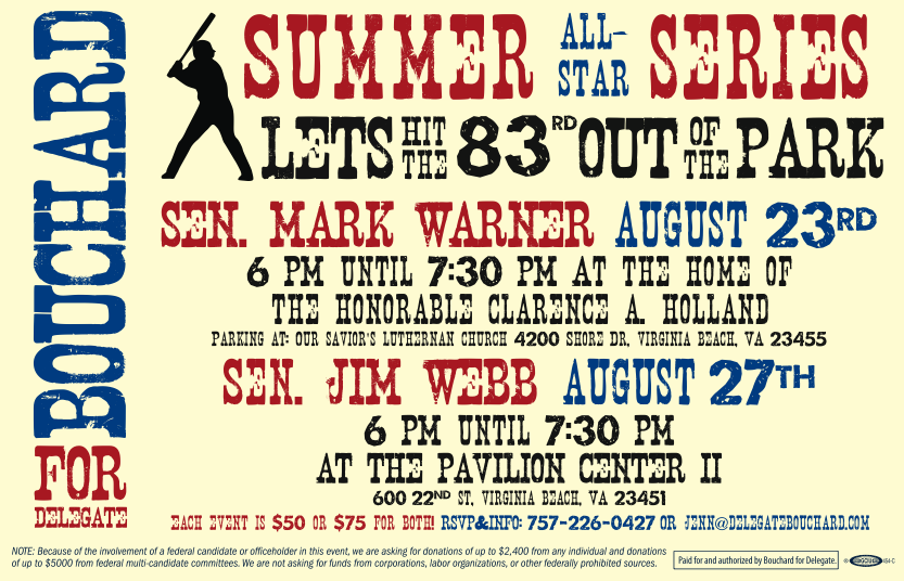 Wow! Delegate Joe Bouchard is bringing in the heavy hitters – Senators Mark Warner and Jim Webb!
