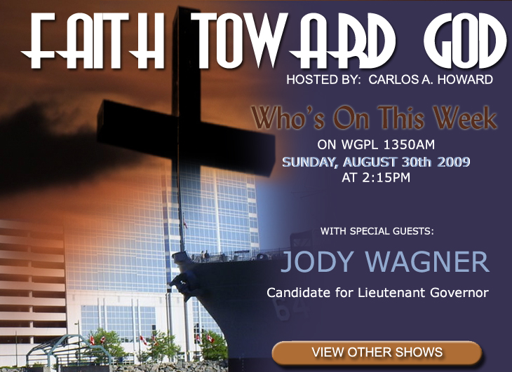Jody Wagner, the Democratic candidate for Lieutenant Governor, will be the guest on “Faith Toward God” this Sunday. The show airs at 2:15pm on WGPL, 1350AM.