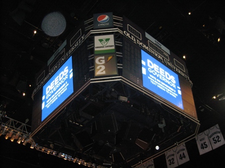 Levar Stoney, former DPVA executive director, now Deeds’ political director, acted as MC for the event. When he announced the first speaker, hesitating after the word “president,” the crowd went wild. He was introducing, of course, ODU President John Broderick. In fairly quick succession, we heard from AG candidate Steve Shannon, LG candidate Jody Wagner and Gov. Tim Kaine. Probably the funniest moment of the affair was when the woman singing the National Anthem messed up the words! Perhaps she was nervous but man – she was making up the words as she went along. Not quite the same as Ella Fitzgerald, but still.