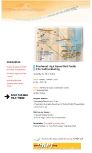 The City of Norfolk is hosting a public information meeting this coming Tuesday, October 5, on high speed rail (click on picture for a larger view and live links).