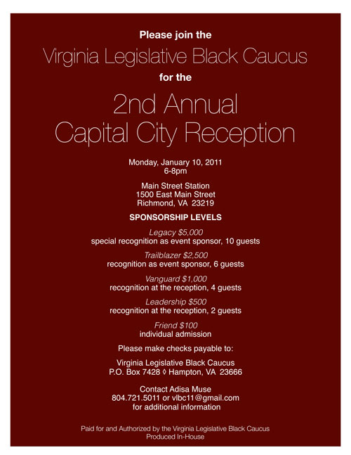 The Virginia Legislative Black Caucus is hosting its 2nd Annual Capital City Reception this coming Monday, January 10, 2011, from 6pm to 8pm. The event will be held at the Main Street Station, 1500 East Main Street in Richmond. Sponsorships are available, individual admission is $100. RSVP to Adisa Muse at 804.721.5011 or by email.