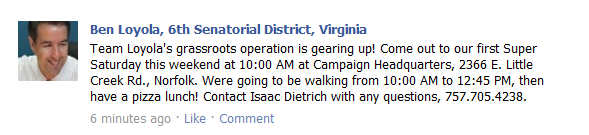 I know this is a late post for this article, but as the election gets closer, it’s now not just the candidate’s office that is in the wrong district. The street signs for Loyola are getting heavier in the Norfolk portion of Wagner’s district. Every time I’ve taken a walk through the neighborhood in the last couple of weeks, I’ve seen a new sign for the 6th district candiate placed in the 7th district. The shared office argument is one thing, but signs in the wrong spot? If the candidate can’t limit the simplest of campaign resources to his own district, how can he be expected to be a good steward of the state’s resources as a whole? And the extra signs will add to the confusion that’s going to exist anyway with regards to the new district lines.
