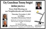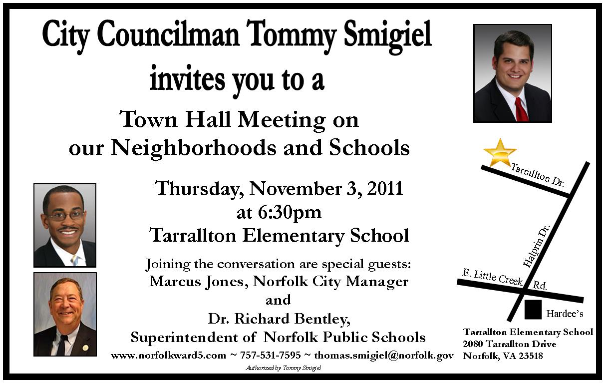 I am hosting a town hall meeting November 3 (click on image to enlarge) on the issues of neighborhoods and schools. Joining me will be City Manager Marcus Jones and Norfolk Public Schools superintendent Dr. Richard Bentley.
