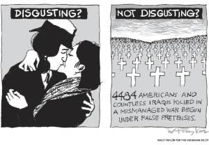 Without commenting on the merits or demerits of the kiss, the cartoonist destroys his own credibility by repeating the far-Left lie that our mission in Iraq was “begun under false pretenses.”