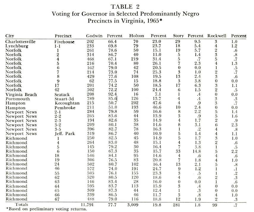 I keep being drawn back to the gubernatorial election in 1965. Democrats won – and although the poll tax was still in effect, did so with the help of the black vote (see chart). Conservative Democrats, upset with Mills Godwin’s outreach to black voters, had their own candidate – my friend’s dad, Bill Story.