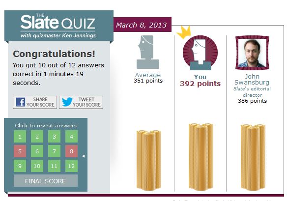 I didn’t do too badly (click to enlarge). You get points not only for right answers but also for how quickly you answer. I think I got a little carried away, trying to be fast. Nevertheless, I scored above average – and above Slate’s editorial director š