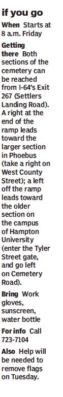 The Hampton National Cemetery is in need of help this Friday to plant flags on the 28,000 graves for Memorial Day. I grew up in Phoebus and walked by that cemetery often. It is located next to the church that I attended, and still consider my home church.