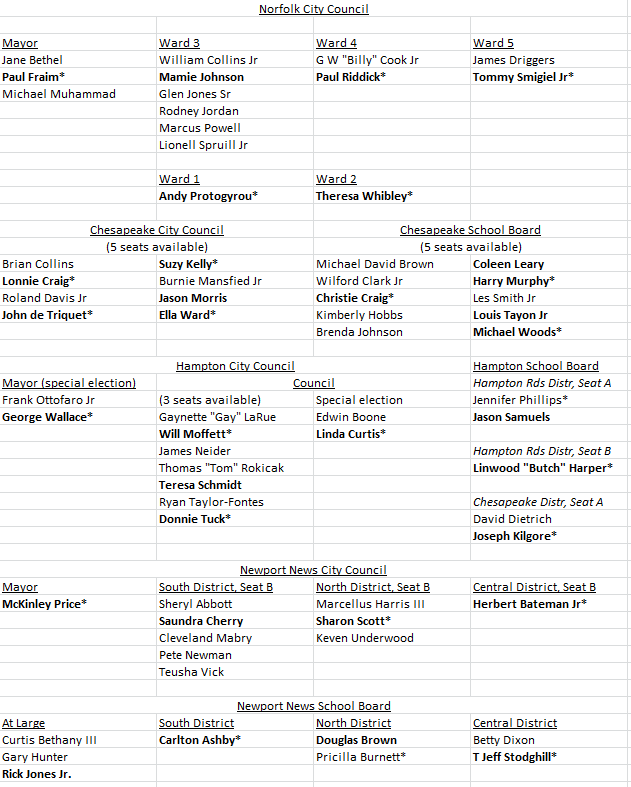 Winning candidates are in bold below. UPDATED 5/8/14 for change in Chesapeake