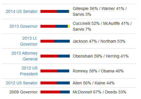 Note that the only Democrat to win this district in recent years is Ralph Northam. Given the Republican margins in the other contests, that Northam won the district should remind you of just how bad a candidate E.W. Jackson was. Northam, though, underperformed his statewide totals, in which he received more than 55% of the vote.