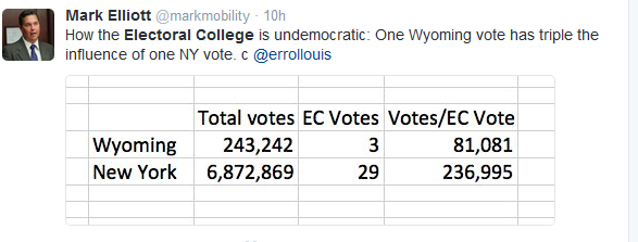 One other thing that has bugged me is all this dumping on the Electoral College. (As one of Virginia’s 13 electors, I will be proudly casting my vote for Hillary come December 19th.) The problem isn’t the Electoral College but the House of Representatives. It is time to expand the number of members there.