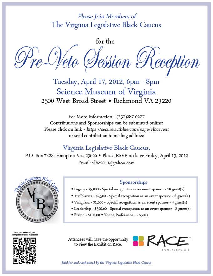 The Virginia Legislative Black Caucus is holding a pre-veto session reception next Tuesday, April 17. The event will take place from 6pm to 8pm at the Science Museum. RSVP by this Friday, April 13. For obvious reasons, I won't be there. But I hope the attendees have a good time. And have a drink (or … Continue reading VLBC reception 4/17