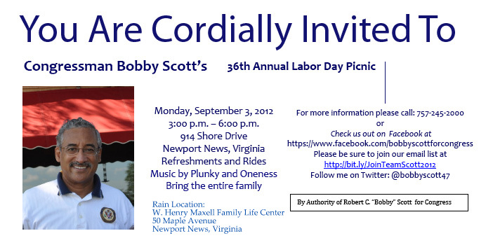 It's time for the best party in Hampton Roads! Rep. Bobby Scott is hosting his 36th Annual Labor Day Picnic. Click to enlarge for details. See you Monday!
