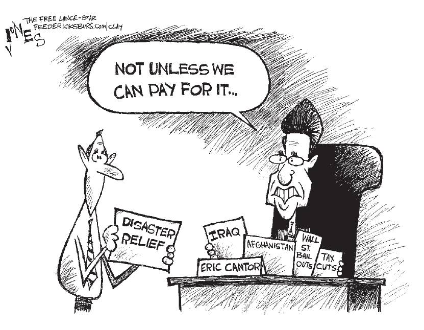 This cartoon accompanied my latest op-ed, title above, which appeared in The Virginian-Pilot Wednesday. Since it was published, we've learned that Majority Leader Eric Cantor "voted against an amendment to an emergency supplemental bill for disaster aid that would have 'fully offset' the cost of that supplemental with 'a proportional reduction of FY05 discretionary funding' … Continue reading A deficit hawk in a hurricane